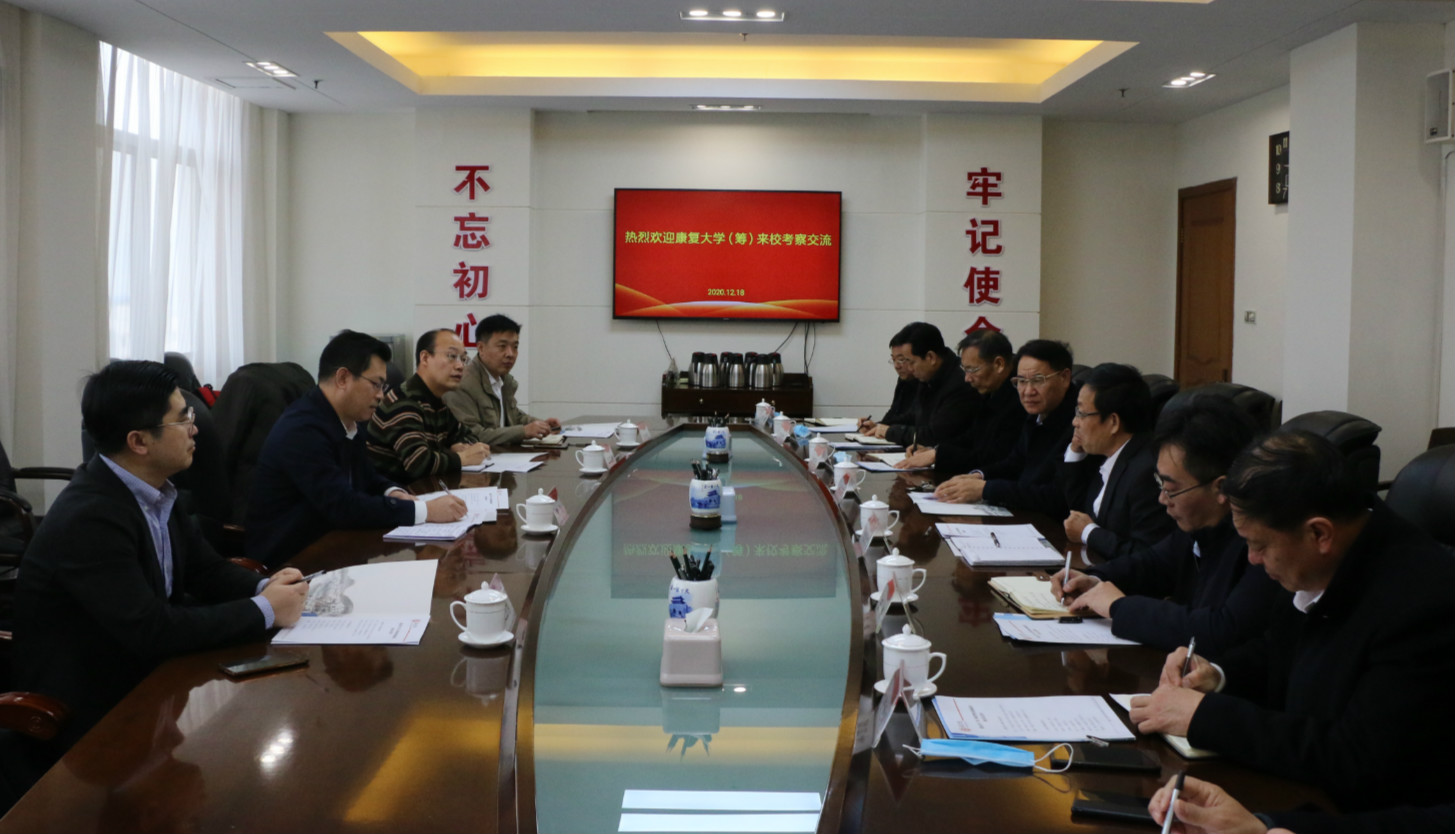 12月18日上午,康复大学(筹)领导小组成员、临时党委委员黄飞一行4人来校考察,就特色办学、人才引进、新校区建设等方面工作与LETOU官网进行交流探讨,校党委书记曹胜强、校长李文喜、副校长明清河在综合楼接待室会见了黄飞一行。