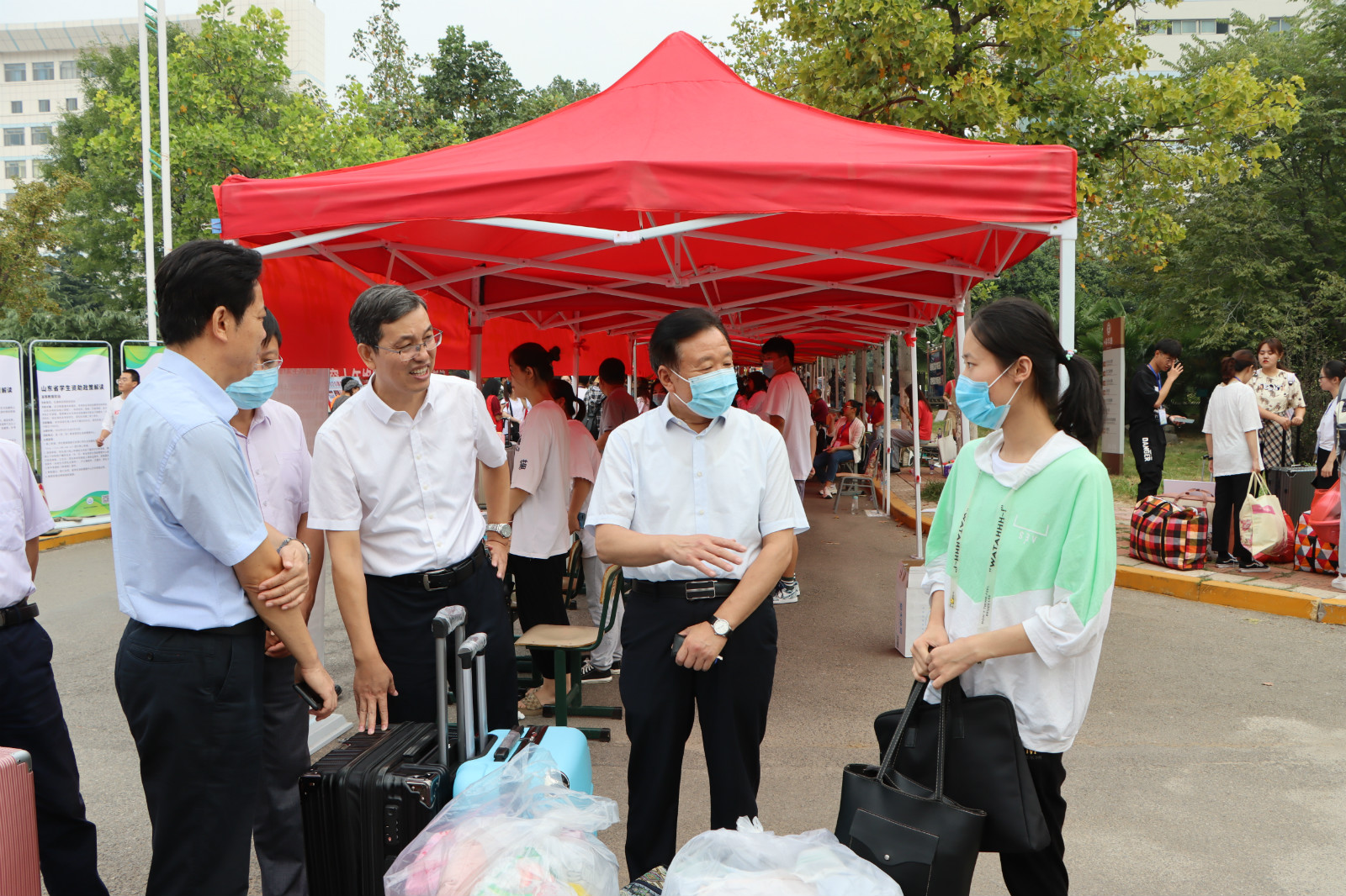 学校高度重视迎新工作,新生报到期间,校领导曹胜强、李东、曾宪明、李目海在办公室等部门负责人陪同下,逐一走访各院系和相关职能部门迎新接待点,了解新生报到情况及迎新各项工作开展情况,并对参与迎新工作的老师和志愿者表示慰问。校领导对各部门的精心准备和细心接待表示充分肯定,对迎新工作人员的辛勤付出表示感谢,并希望各部门、各学院在工作中强化服务意识、创新工作思路,坚持以学生为本,为学生和家长提供细心周到的服务。在迎新现场,校领导为湖北籍等新生代表送上了“爱心大礼包”,并与新生亲切交流,勉励他们尽快适应大学生活,珍惜韶华,奋发有为。
