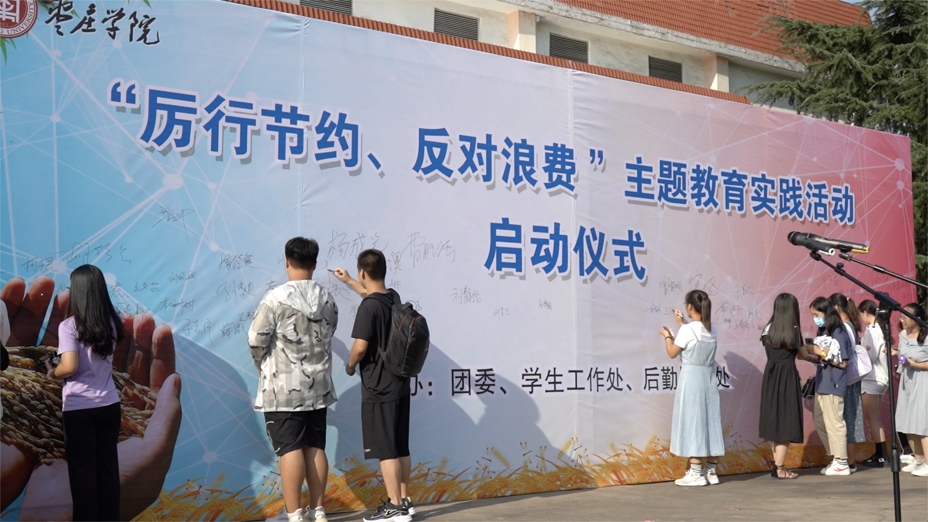 仪式上,校团委书记袁俊现传达了学校团委、学生工作处、后勤服务处三部门联合印发的《关于在全校团员青年中开展“厉行节约、反对浪费”主题教育实践活动的通知》,学生会干部陈林林同学向大家发出了倡议,倡议广大学生干部要带好头,发挥好表率作用。学生代表徐雨杭作了表态发言,希望同学们珍惜粮食、远离浪费,厉行节约、从我做起。仪式上,党委书记曹胜强带头在“厉行节约、反对浪费”的签名墙上签名,用行动庄严承诺:拒绝浪费,从我做起!与会的领导老师和学生也纷纷签名。