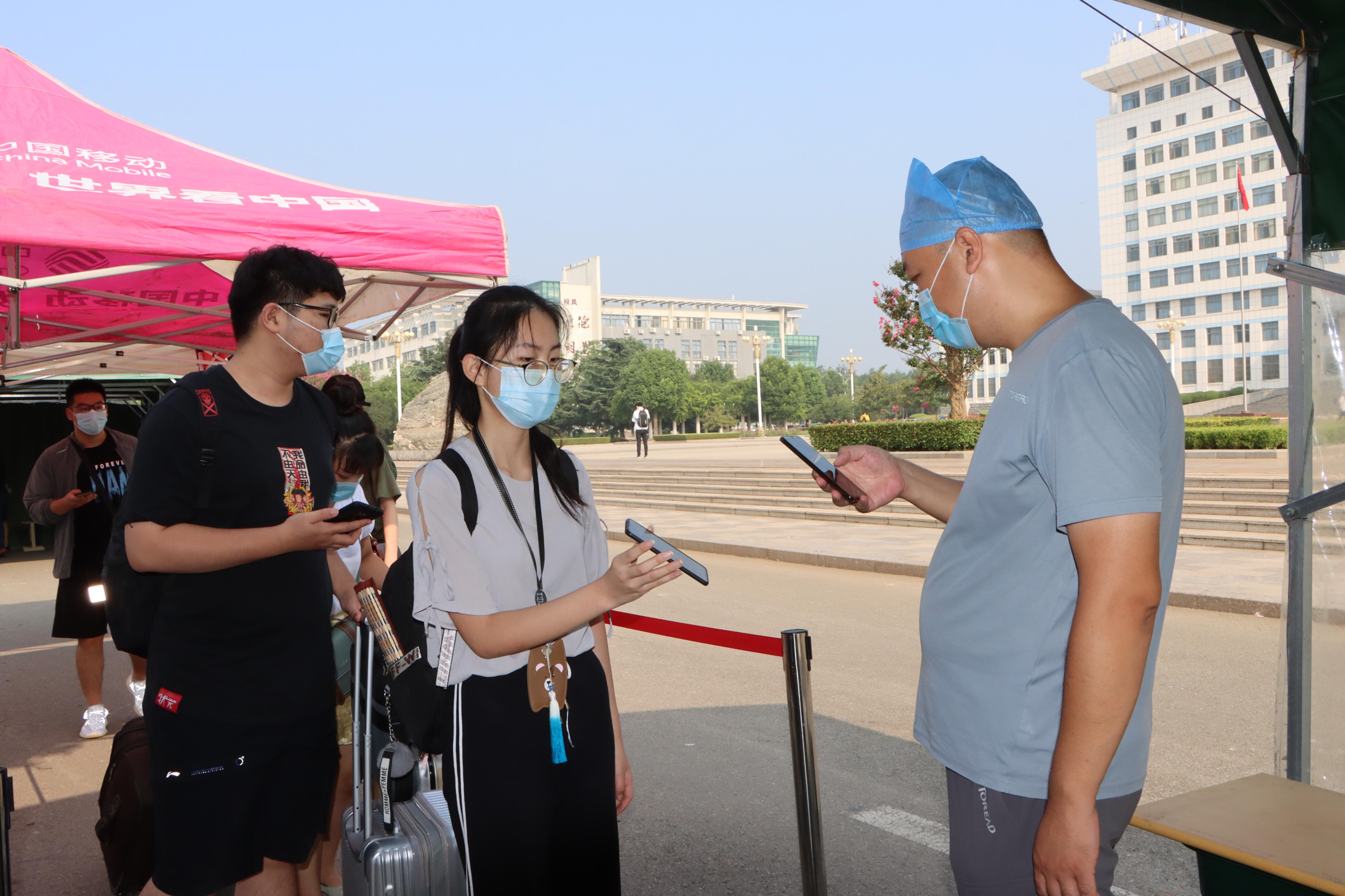 报到现场,学生下车后立即进入专用通道,由工作人员指引,完成红外线测温、健康码和返校码核验等程序,即可返回宿舍,学生工作处、团委及保卫处工作人员负责维持秩序和指引,相关职能部门通力协作,整个报到流程通畅快捷,报到现场井然有序。