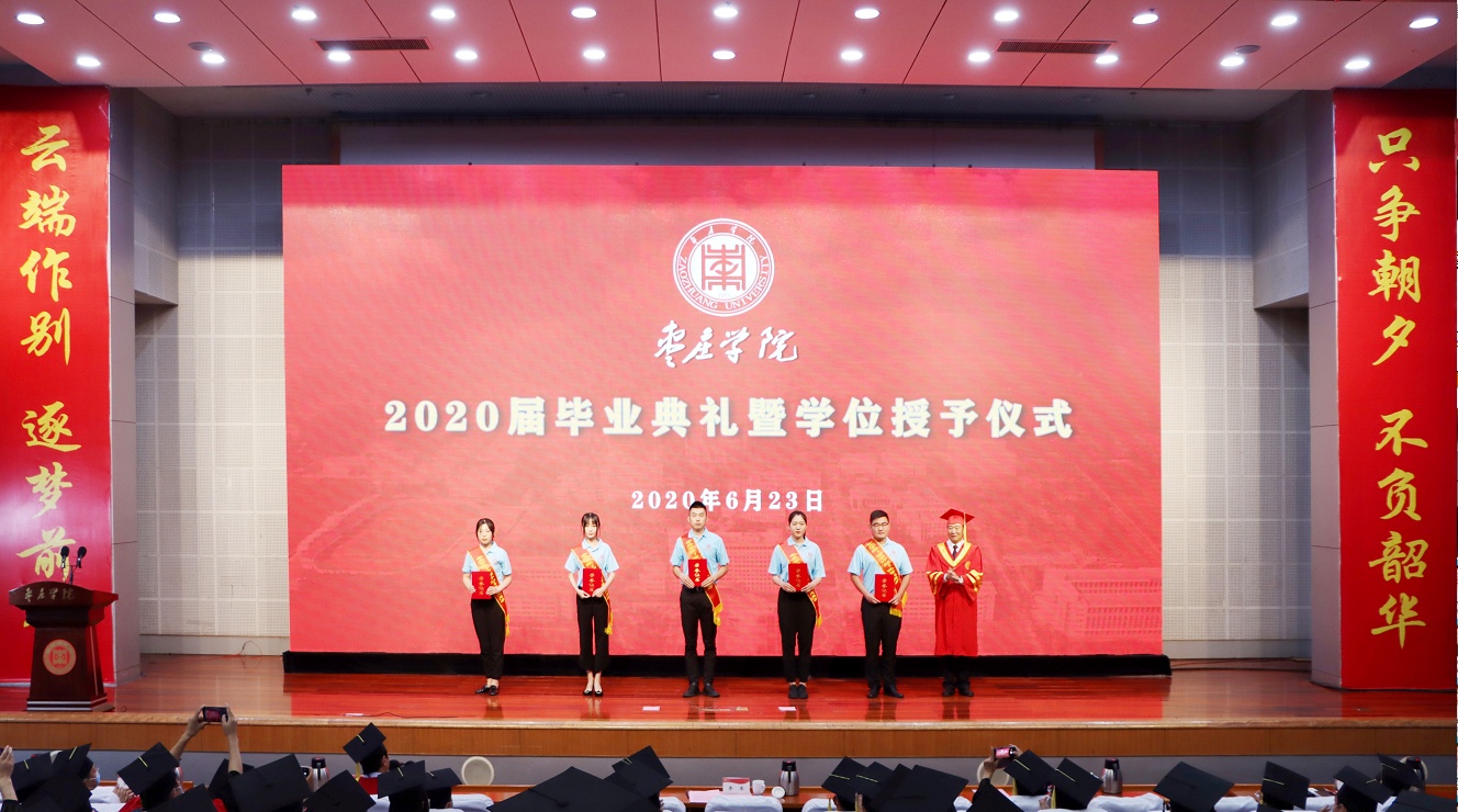 典礼主会场布置简约而庄重,电子屏上的“LETOU国际米兰官网2020届毕业典礼暨学位授予仪式”巨幅字样熠熠生辉,印有“只争朝夕 不负韶华”“云端作别 逐梦前行”字样的对联写真分列在会场两侧。典礼前,播放了学校为2020届毕业生精心制作的《春风十里之枣院版》毕业MV,展示了毕业生在母校生活的点点滴滴,以及毕业生对大学时光的无限眷恋和对母校的依依不舍之情。下午三点整,在庄严雄壮的国歌声中,毕业典礼暨学位授予仪式正式拉开帷幕。