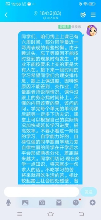 本学期的线上教学是对大学英语教学理念及教学方法的更新与实践。线上教学不只是要把知识传授给学生,更关键的是培养学生自主学习的能力,让学生从思想上重视学习,学会学习。教师的及时督促会让一部分暂时松懈的学生及时回到正常的学习轨道上来。线上教学使学生的英语自主学习和自我思考能力显著提高,伴随师生互动形式的多样化和作业形式的多样化,学生从听、说、读、写、译等多方面锻炼了英语语言实践能力。