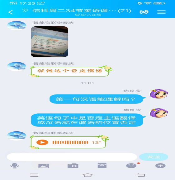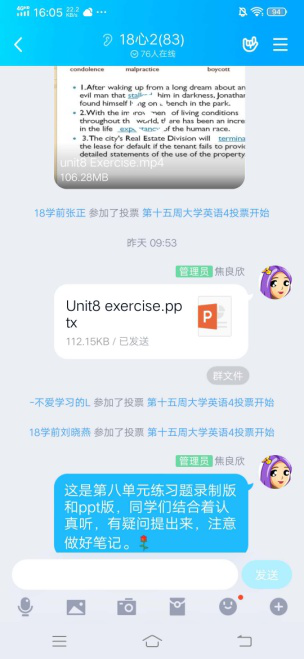 《大学英语4》是为非英语专业本科二年级学生开设的公共英语课程。本课程旨在培养学生语言技能,培养学生的英语综合应用能力,以及理解、沟通、表达能力和批判性思维能力,培养学生的跨文化交际意识和交际能力,为“讲好中国故事”和学习国外科学知识搭建沟通桥梁。大学英语教学部焦良欣老师本学期担任《大学英语4》四个本科班的教学工作,在深入分析学情的基础上,设计了“PPT录播+QQ群投票签到+QQ群在线上课+QQ群作业+U校园+课后反馈”的混合式线上教学模式。