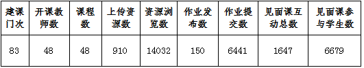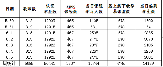 本周线上教学课程1054门、2965门次;参与授课教师815人,涉及教学班级2182个,学生学习人次数167161;累计上线学习学生人次数占累计应上线学习人次数比例为99.41%。