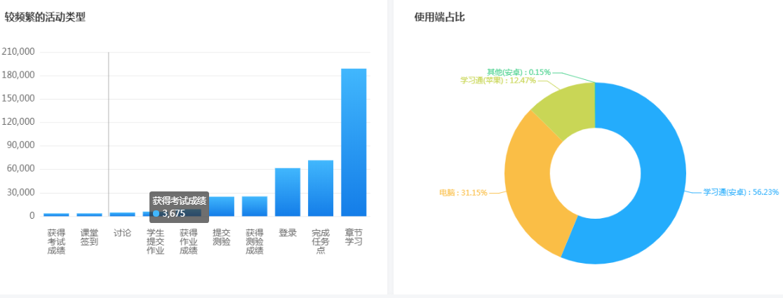 根据超星平台提供的大数据分析,可以查看本周课程打开次数、课程访问排行、较为频繁的活动类型、活跃度最高的院系和学习端口占比分别为: