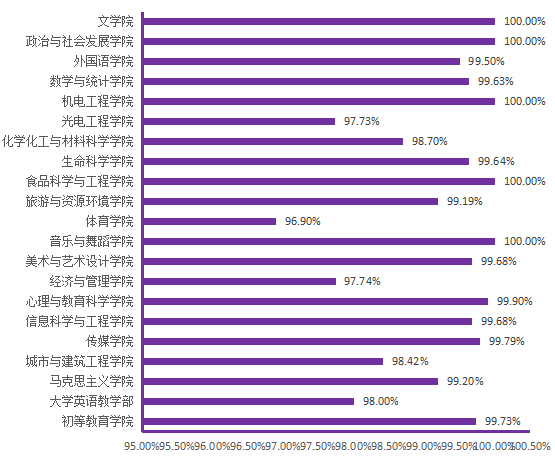 各院(部)的开课数、开课门次、班级数、教师数(人次)、学生数(人次)和学生上课率情况如下图所示: