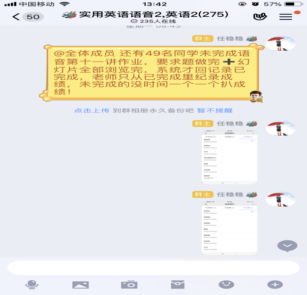 一、课前,将做好的预习课件发布在长江雨课堂的班级里。为防止有的同学错过截止时间只能查看课件无法进行预习检测,同时为了避免有的同学,只浏览预习课件的前几页,敷衍预习任务,预习课件发布完,任老师会同步在QQ群里进行提示,告知预习内容、截止时间以及是否有预习检测,也会时不时把学生的具体的预习情形发布在QQ群方便学生参考对照,并加以督促。