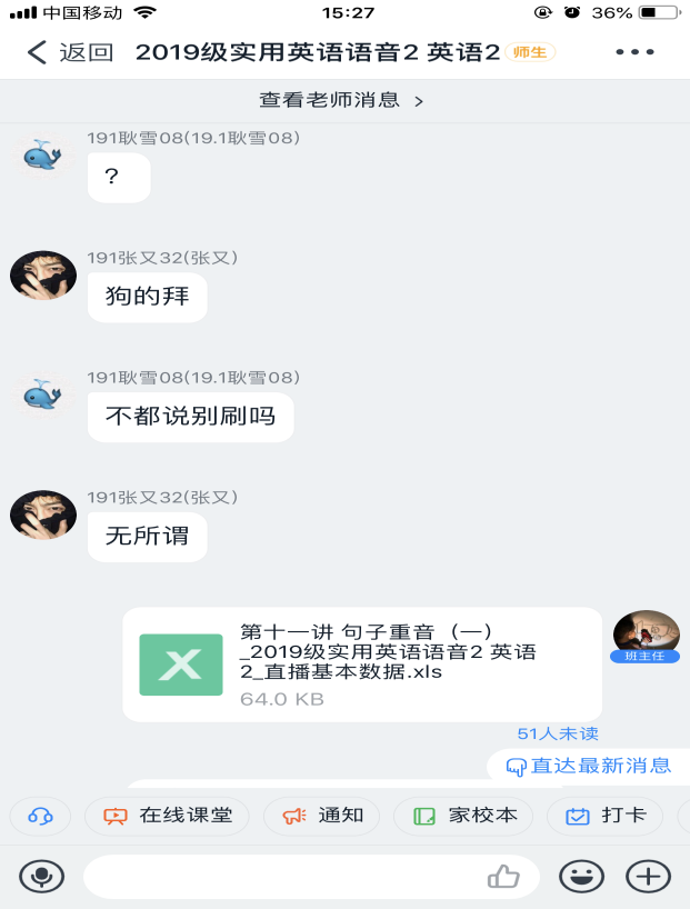 二、课中,利用钉钉直播,钉钉群语音和文字互动。本计划采用QQ群课堂直播授课,但课前测试遇到卡顿,所以决定使用钉钉进行直播。