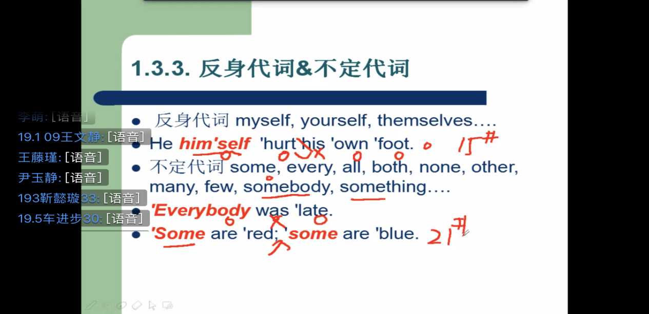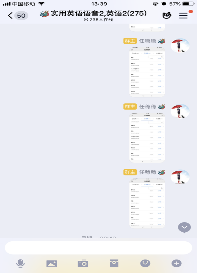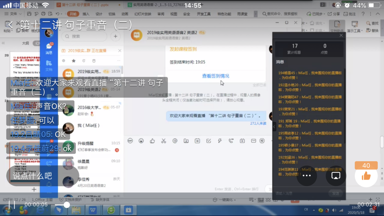 2.直播中利用“分享屏幕进行课件讲解+群语音练习+直播点评”进行授课。整体不怎么卡顿,学生语音练习流畅,老师点评略有延时,总体上说比较顺利。