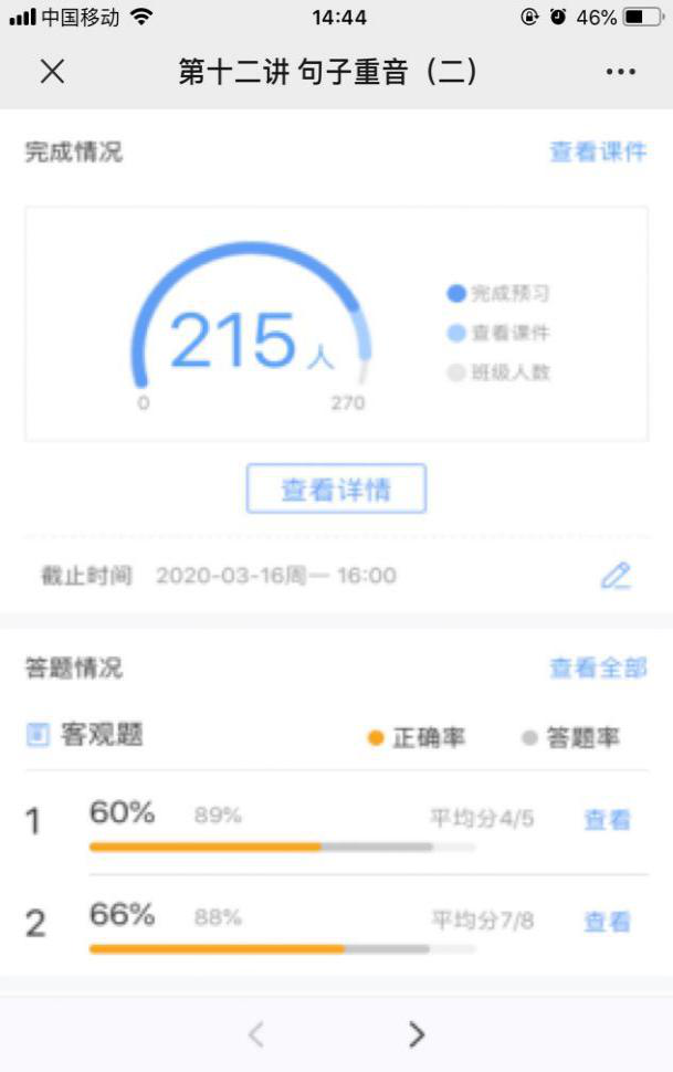 首先把一些需要理解的重音概念和规则放在了预习部分,通过长江雨课堂发布和进行预习效果检测,其次利用钉钉进行直播授课,着重讲解重音理解的难点和指导重音朗读练习,最后利用微信小程序“每日作业”布置和批改口头练习作业,把控学生掌握的情况,