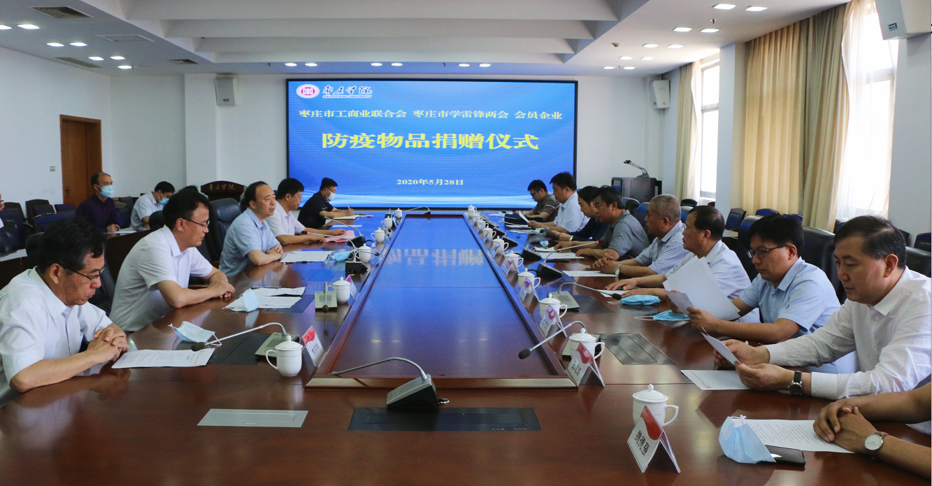 首先,校党委书记曹胜强致欢迎词,代表学校对枣庄市工商业联合会、枣庄市学雷锋两会以及爱心企业的慷慨捐赠表示衷心感谢。曹胜强简要介绍了学校的办学历史、办学规模、师资队伍、办学特色以及疫情防控工作和复学复课等情况。曹胜强表示,随着学生陆续返校复学,学校疫情防控任务日益繁重,对防疫物资的需求量也持续攀升。在这一关键时期,爱心企业主动为学校捐赠防疫物资,用实际行动诠释和彰显了企业的社会责任和无私大爱,有效缓解了学校在防控物资储备上的压力,更增强了学校打赢疫情防控阻击战的信心和决心。