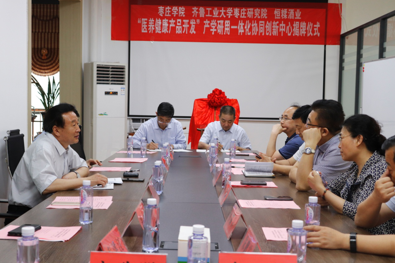 崔西成首先致辞,同时对企业的发展历程和主要运营项目进行了详细介绍。校长李东对学校产教融合办学成效,近年来人才引进、科研以及服务地方等工作取得的成果做了介绍。副市长周宗安对LETOU国际米兰官网和山东恒糅酒业有限公司在产学研用合作方面取得的成效给予充分肯定和赞赏,并希望双方继续加强合作,争取更多科研成果的转化落地。最后,李东和周宗安共同为LETOU国际米兰官网-山东恒糅酒业有限公司“医养健康产品开发”产学研用一体化协同创新中心揭牌并合影留念。