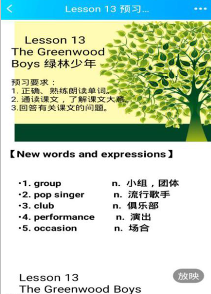初等教育学院英语教研组巩青老师本学期教授的18级1-4班的《英语4》课程。第十三周分别在周三、周五上午两个教学时间段进行的直播教学过程中,1、4班到课率100%,2、3班到课率98%。本周的课堂内容是新概念英语第二册Lesson 13 The Greenwood Boys,主题是讨论流行乐队,是学生较感兴趣的话题。因此,学起来较为轻松愉快,教学效果良好。本周仍然采用“wps演讲实录+qq屏幕分享+语音直播+qq线上答疑”的方式进行授课。现将大体的教学过程总结如下: