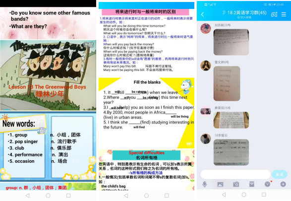 通过这些课堂活动基本能够了解到哪些学生在参与课堂。在直播过程中,学生能够积极地回应老师提出的问题,进行实时互动。通过课堂练习答案的实时发送和检查,发现学生听懂、听会了本课的重点和难点——将来进行时的用法和名词所有格的变化规则。