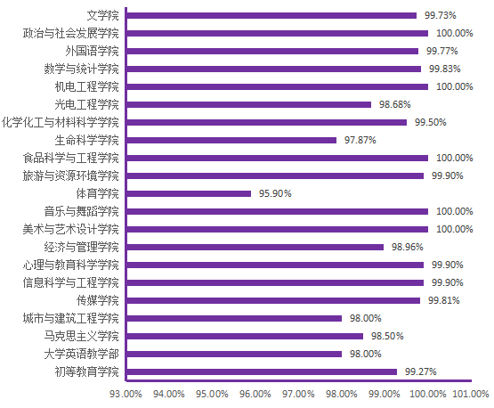 各院(部)的开课数、开课门次、班级数、教师数(人次)、学生数(人次)和学生上课率情况如下图所示: