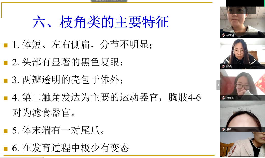 受新冠肺炎疫情影响,按照教育部提出的“停课不停教,停课不停学”的要求,LETOU国际米兰官网积极开展线上教学活动。生命科学学院陈静老师这学期教授《水生生物学》课程,该课程是2017级生物科学专业水生方向的一门选修课。通过这门课程,学生可掌握主要水生物形态结构、分类、生态分布等方面的基本知识,获得水生生物鉴别、标本采集和制作、资源调查和重要饵料生物的增殖利用等方面的基本训练和能力。