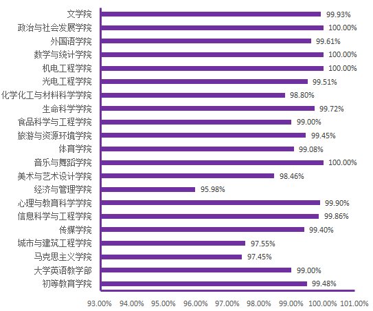 各院(部)的开课数、开课门次、班级数、教师数(人次)、学生数(人次)和学生上课率情况如下图所示: