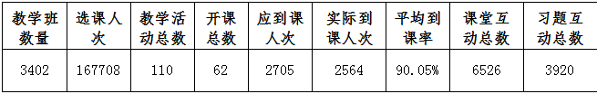 LETOU官网师生在雨课堂平台使用情况,根据大数据统计,由此查看本周教学班数量、教学活动总、开课总数、应到课人次、实际到课人次、课堂互动总数、平均到课率、习题互动总数,详情见下表: