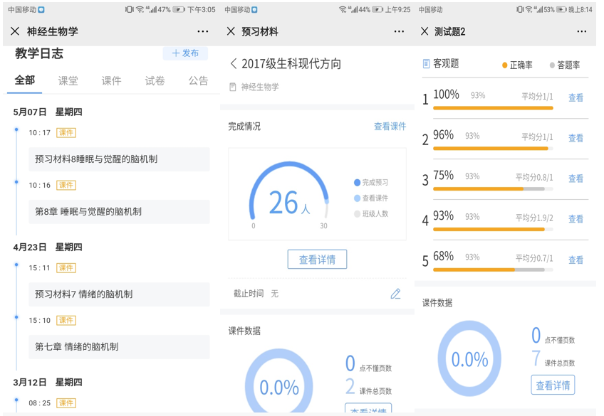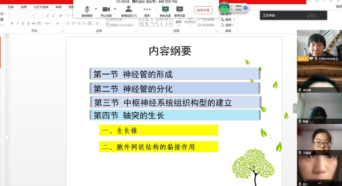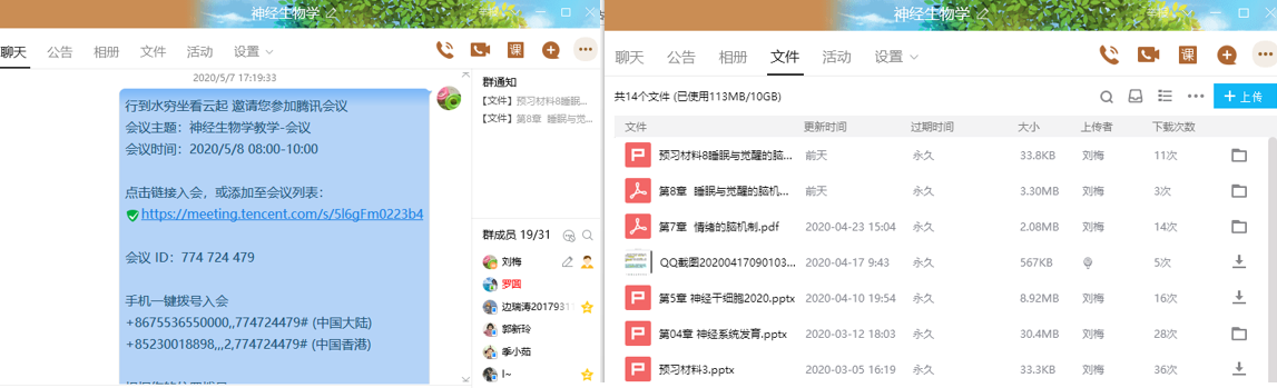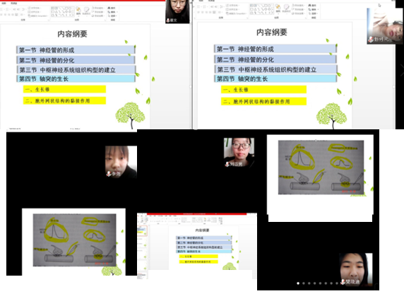 为响应“停课不停教,停课不停学”号召,生命科学学院刘梅老师学期初在参加了雨课堂、智慧树等平台培训后,开始在线讲授《神经神经学》课程。根据专业的培养目标及课程大纲,她选择了雨课堂课程,同时使用腾讯会议直播。同时,为了更好完成课程教学任务并督促学生学习,在雨课堂、QQ群进行沟通交流。具体做法如下:
