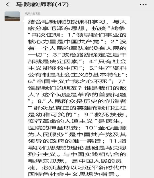 疫情当前,马克思主义学院在学校教务处的组织协调下,极响应教育部“停课不停学、停课不停教”的号召,落实学校关于线上教学的要求,牢记习近平总书记在全国思想政治理论课座谈会重要精神,深入贯彻学校“777互联互通育人工程”,结合《毛泽东思想和中国特色社会主义理论体系概论》课程特点和学生学情,彰显抗击疫情战役中的爱国主义教育。本课程教师团队协作,确保教学质量。