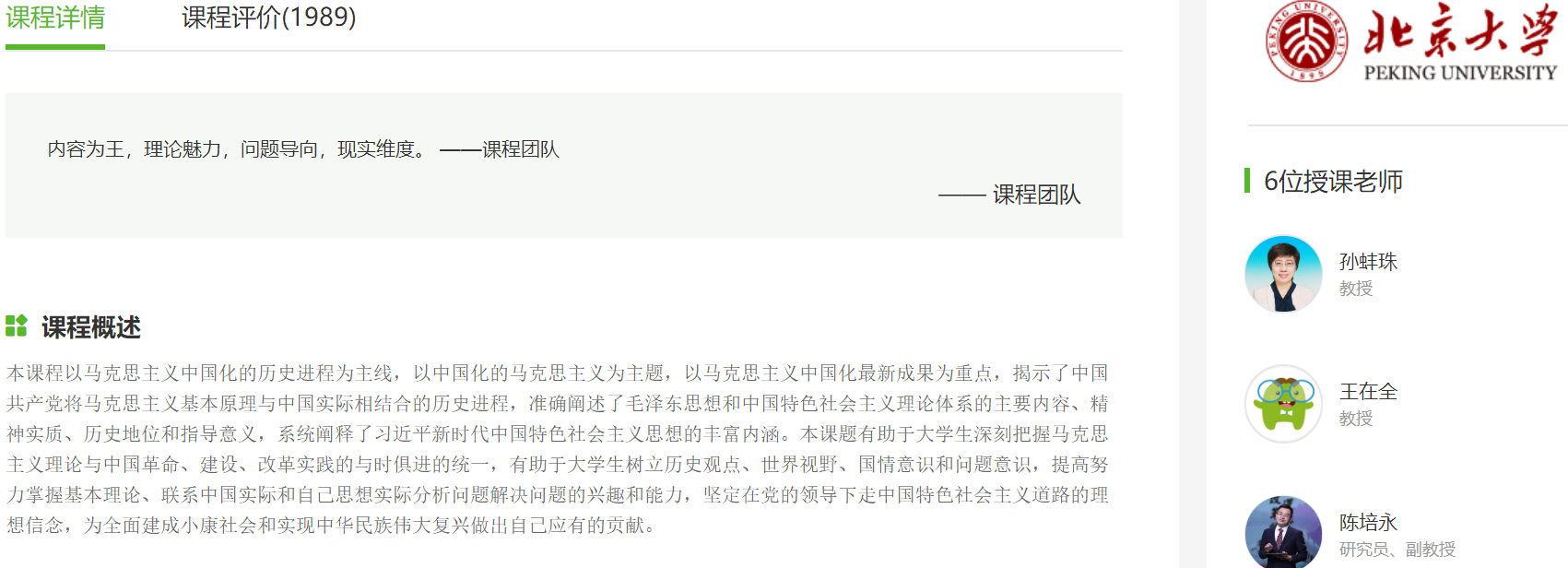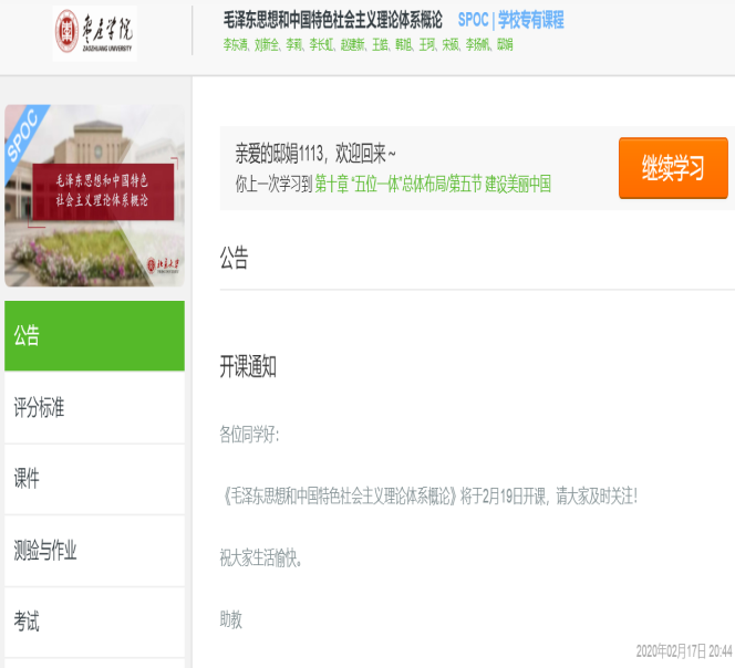 本课程首次采用“互联网+”形式进行授课,利用中国大学MOOC平台,申请了北京大学孙蚌珠教授的异步SPOC课程《毛泽东思想和中国特色社会主义理论体系概论》。该异步SPOC具有国内顶尖水平,为同学们提供了最前沿的知识讲解,教学方式生动活泼,重难点突出,使同学们易于接受。