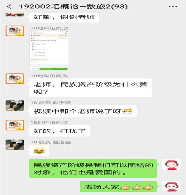 在中国大学MOOC的基础上,邸娟老师建立了用于签到、讨论、练习和发布作业的慕课堂,激活了同学们线上学习的热情和动力,使同学们在忙碌和充实中,不断提高自身本领。同时,利用教学班微信群作为课前信息发布和线上教学补充,最大程度上保证每节课的丰富性和完整性。