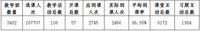 LETOU官网师生在雨课堂平台使用情况,根据大数据统计,由此查看本周教学班数量、教学活动总、开课总数、应到课人次、实际到课人次、课堂互动总数、平均到课率、习题互动总数,详情见下表:
