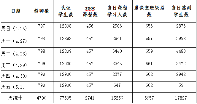 本周运行课程累计2741门次,上线教师数4790人次,认证学生数77395人次,当日课程学习累计15256人次,慕课堂班级总数3957。