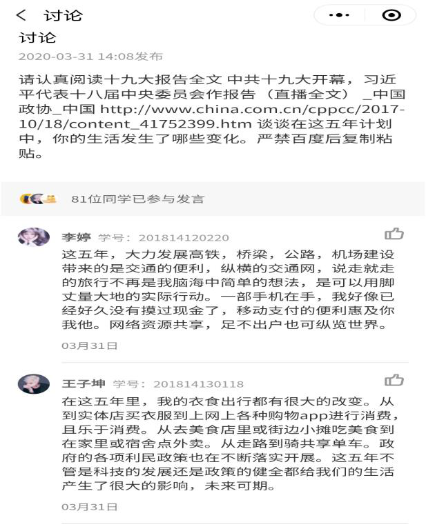 通过采用“中国大学MOOC+慕课堂+微信群”混合教学的方法,能够使不同学科背景的同学们尽快掌握本课程的相关知识点,让同学们在丰富多彩的学习中体会线上教学的乐趣,以达到预期的教学效果。