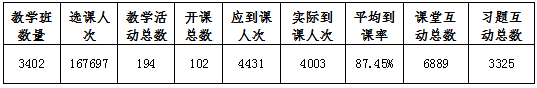 LETOU官网师生在雨课堂平台使用情况,根据大数据统计,由此查看本周教学班数量、教学活动总、开课总数、应到课人次、实际到课人次、课堂互动总数、平均到课率、习题互动总数,详情见下表: