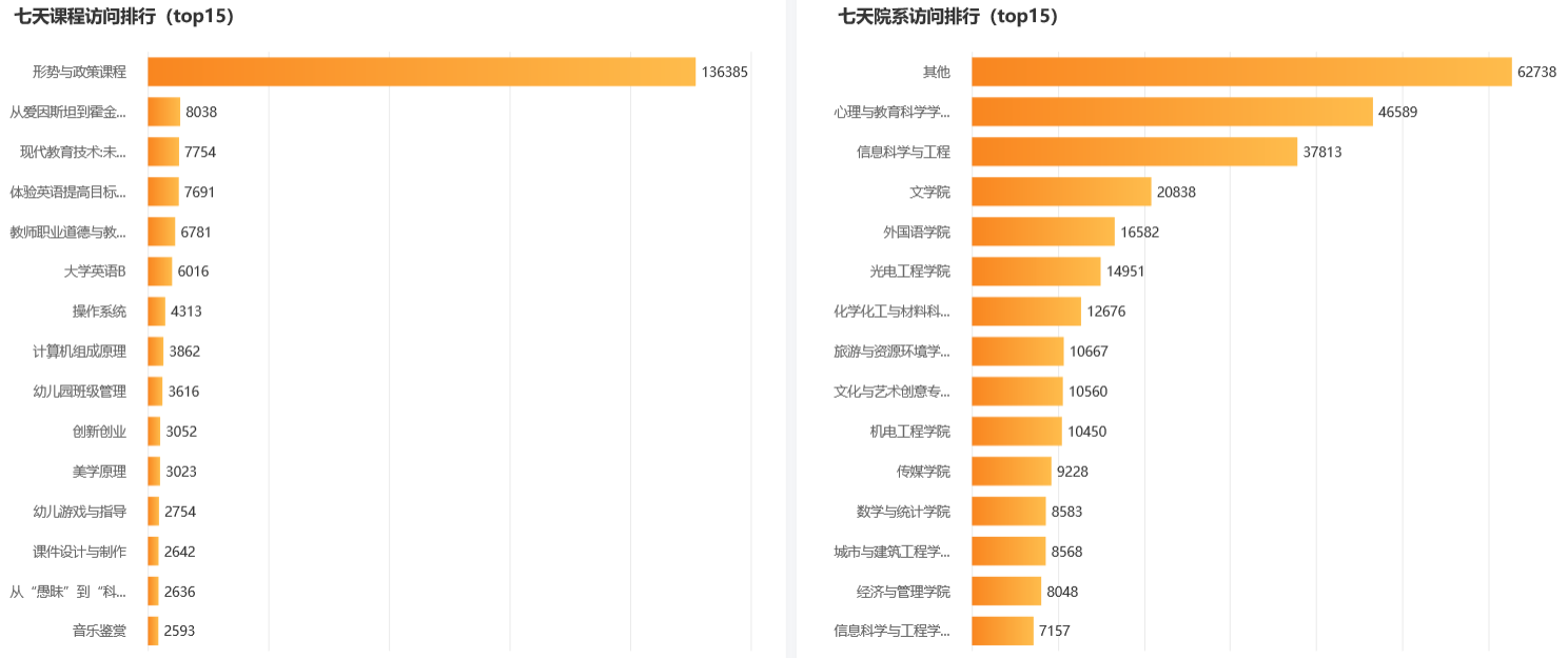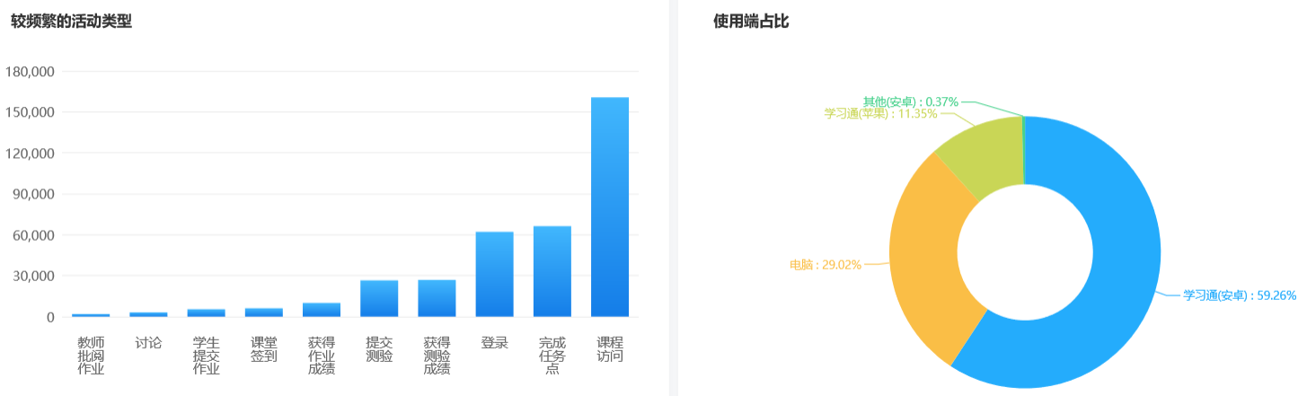 根据超星平台提供的大数据分析,可以查看本周课程打开次数、课程访问排行、较为频繁的活动类型、活跃度最高的院系和学习端口占比分别为: