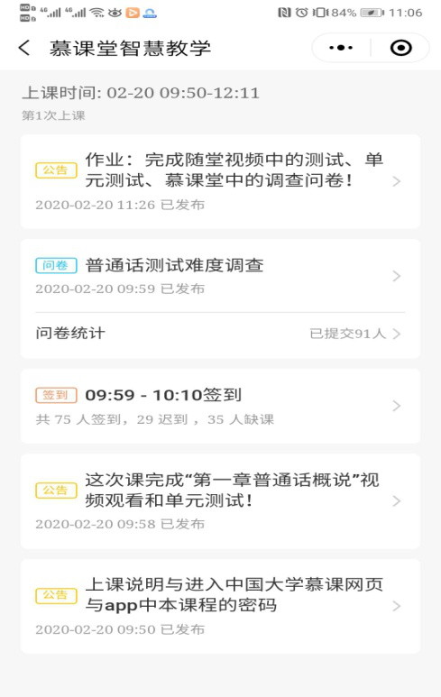 在课程教学中,我们基本都形成了自己的教学流程,摸清了教学的过程。通识课教学,普通话口语教程这门课,基本是微信群、qq群预热,提醒同学何时进入慕课堂,进入慕课堂的重点,整个课程的流程是什么,然后在慕课堂进行练习、问卷的完成,然后认真阅读公告,阅读第二章学习重点,最后进入慕课学习,并完成单元测验。《对外汉语教学概论》采用钉钉直播的方式进行线上教学,按照“签到—复习旧课—讲授新课—小结—课堂测试—整理笔记”几个环节展开展开。
