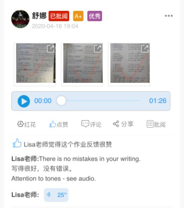 教师把教学内容录入音频、视频,上传到班级微信群,随后学生听音频、看视频,听完看完后在规定时间内去“班级小管家”提交作业,有些同学可能由于网速所限无法上传,就改到微信提交,作业形式多样,包括听力、录音和书写等,旨在全面考察听说读写各项技能,作业提交完毕,教师对每位学生的作业进行个性化反馈,对做得好的方面及时强化,对听说和读写上的错误一一纠正。