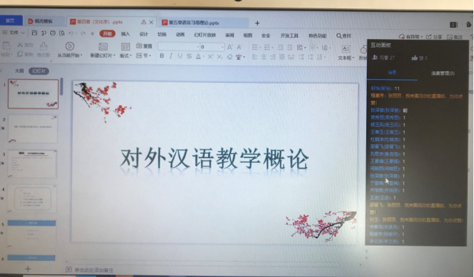 另一种方式是张丽丽老师的“钉钉语音会议+慕课”的方式,在线授课与视频听课相结合,取得了较好的教学效果。因为《对外汉语教学概论》是汉语国际教育专业的核心主干课程,既有知识性的教学目标又有专业技能和素养的目标,教师和学生在直播平台的直接交流,最大可能地利用了网络平台又结合了面对面的教学手段。
