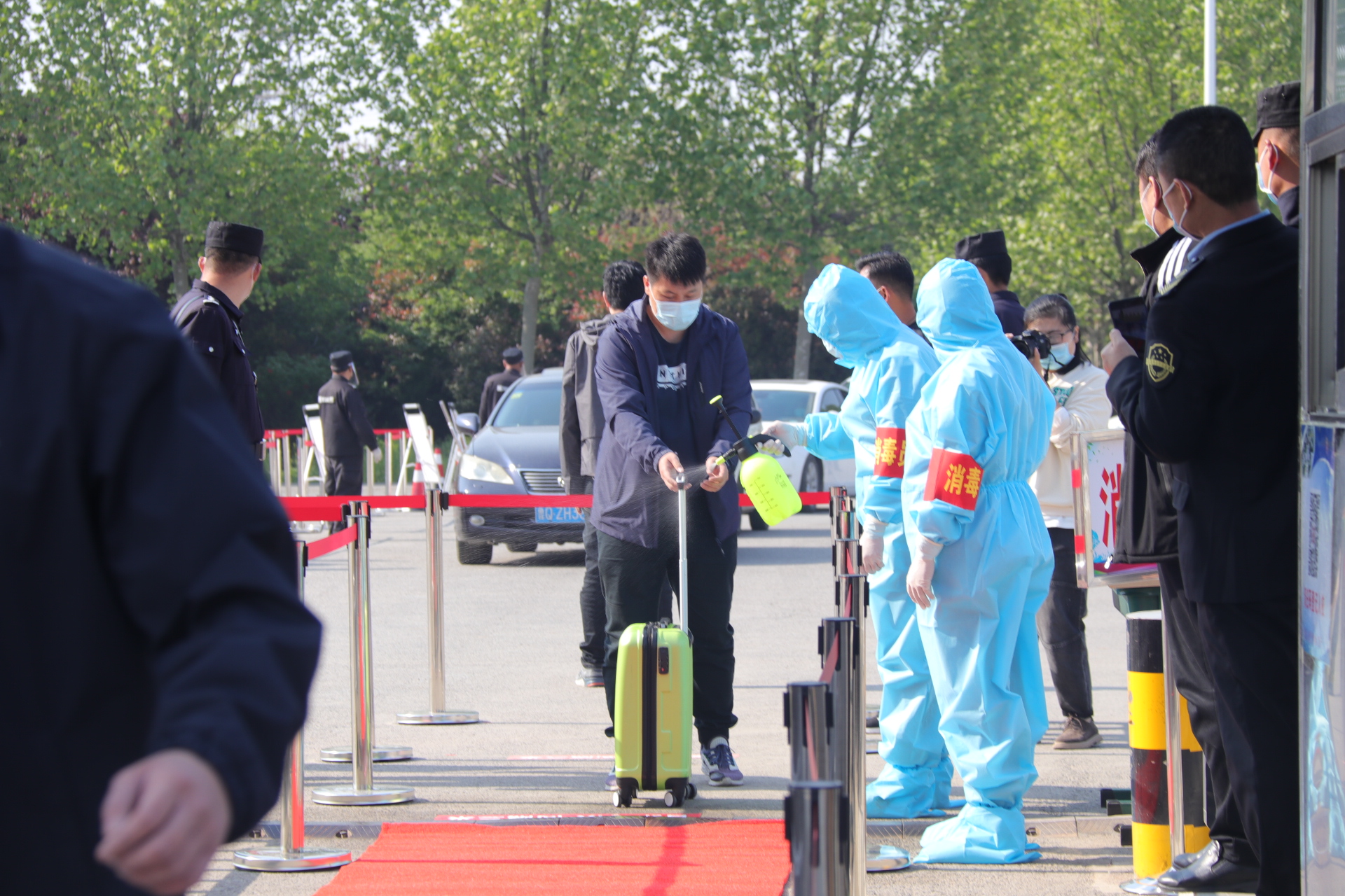 在“学生入校应急演练”环节,由教职工志愿者扮演的返校“学生”佩戴口罩,按照间隔2米有序排成一列。进入消毒区后,消毒区域地面铺有消毒垫对“学生”脚底进行消毒,工作人员对行李进行喷雾消毒。“学生”依次通过自动测温系统时,其中一名“学生”体温显示异常。场地联络员立即将该生引领至临时留观点,留观转诊员对其进行体温复测和症状、流行病学史、旅居史等信息询问,重测体温大于37.3℃,立即启动突发疫情应急处置,留观转诊员电话上报校疫情领导小组汇报情况,并电话联系120救护车到现场。后勤服务组、安全保卫组、学生管理组及综合协调组等工作人员到达现场维持秩序、疏导其他“学生”、协助登记周围人员信息,并对该生经过区域警戒、消毒。