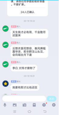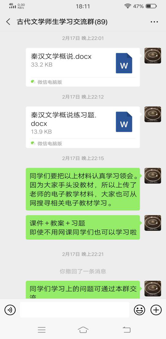 文学院李思华老师本学期承担了2019级专1专2的《古代文学2》(秦汉魏晋南北朝文学)课程。该课程是一门专业基础课程,也是中文类专业的一门核心课程、必修课程、考试课程,非常重要且内容较多。为切实落实教育部“停课不停学”的号召,我们开展了网上授课,利用“微信群+QQ直播+录屏”开展网上混合教学,努力实现高质量网络授课。具体工作如下: