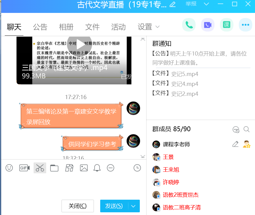 QQ直播(加录屏回放)的方式可以督促学生对于学习薄弱环节或偶有迟到情况也可以采用观看回放的方式进行重复学习。下图为通过录屏回放上传的讲课视频: