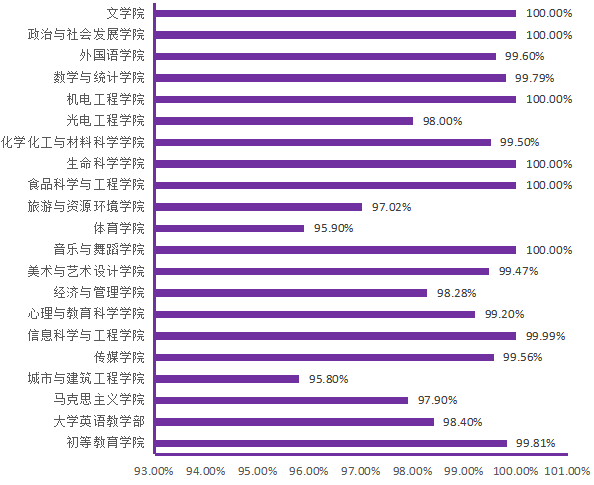 各院(部)的开课数、开课门次、班级数、教师数(人次)、学生数(人次)和学生上课率情况如下图所示: