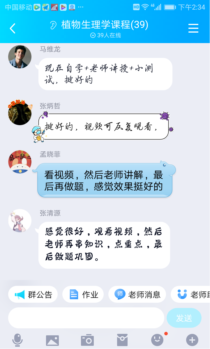 《植物生理学》课堂分四步进行。第一步是通过慕课堂提前5分钟开始学生签到,督促学生按时认真学习;第二步是学生通过慕课平台学习本课内容(30-40分钟)。课间10分钟,学生可以在课间通过QQ提问;第三步是QQ直播(讲受40-50分钟)。直播着重讲解重点和难点内容,同时补充慕课未侧重内容,力求前后知识点的融会贯通。在直播过程随机提问,考察学生课堂跟进情况;第四步是随堂测验与讨论(10分钟)。以往不愿意露脸的同学,在课堂有了更多发言的欲望,线上课堂气氛积极、活跃。对于没有及时签到或未提交测验的同学,李老师在课下通过QQ方式及时联系询问来确认具体缘由,避免因为网络问题或系统问题引起的差错,从而保证不轻易落下一个学生。