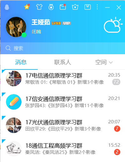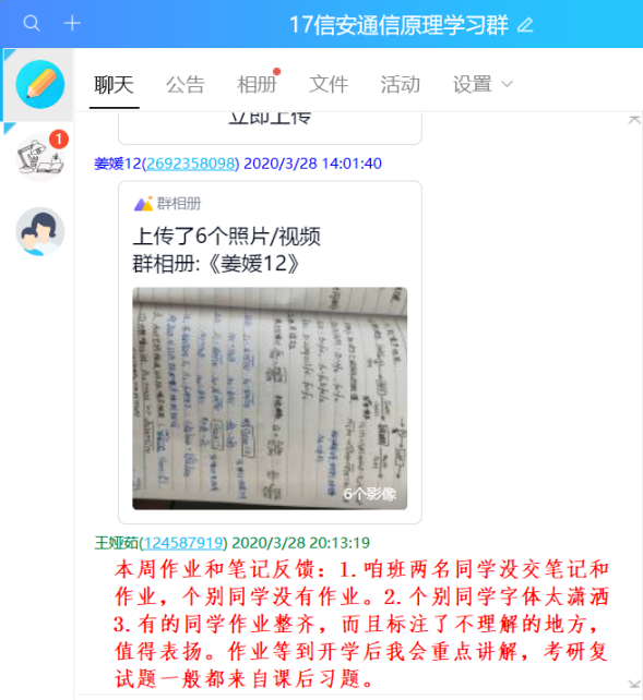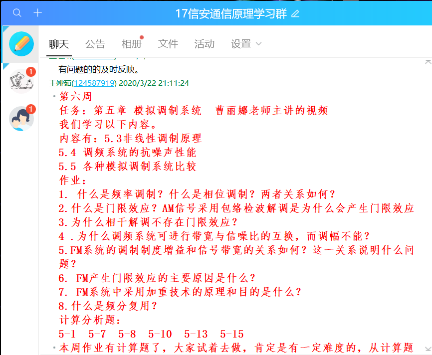 本学期开设的《通信原理》课程有三个教学班,分别是17级电信本科1班、17级信息安全本科1班、17级光伏大数据本科1班。按照学院安排的课程表,提前和班长联系建立班级通信原理QQ学习群和钉钉通信原理学习群,方便安排学习任务与课后答疑。因疫情原因,学生没有课本,及时将电子版教材发给学生,让学生提前熟悉课程内容,做好上课准备。