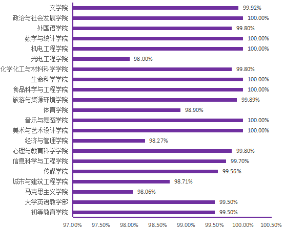 各院(部)的开课数、开课门次、班级数、教师数(人次)、学生数(人次)和学生上课率情况如下图所示: