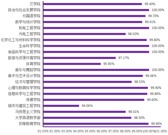 各院(部)的开课数、开课门次、班级数、教师数(人次)、学生数(人次)和学生上课率情况如下图所示: