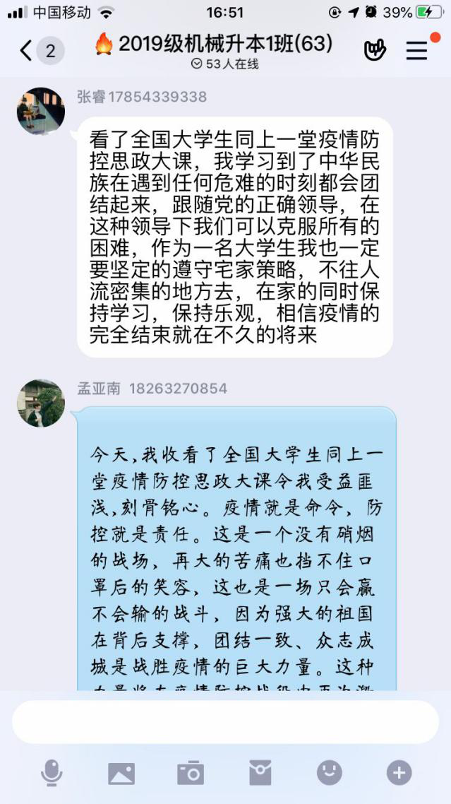 本次大课主要引导广大学生增强“四个意识”坚定“四个自信”做到“两个维护”,坚定在以习近平同志为核心的党中央坚强领导下打赢这场疫情防控人民战争。同学们在观看后反响热烈,纷纷在班级群内留言表示,为国家和人民在疫情中的果敢担当感到骄傲,坚定了战胜疫情的信心,在接下来的学习中将更加发奋图强,担当时代使命,书写大写青春。