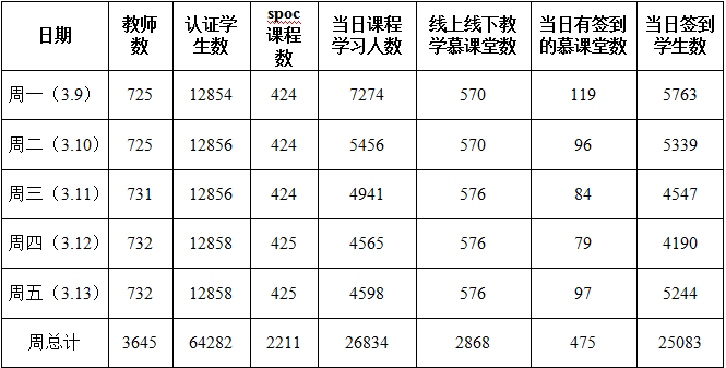 本周运行课程累计2211门次,上线教师数3645人次,认证学生数64282人次,当日课程学习累计26834人次,线上线下教学慕课堂数2868,当日有签到的慕课堂数累计475,当日签到学生数累计25083。