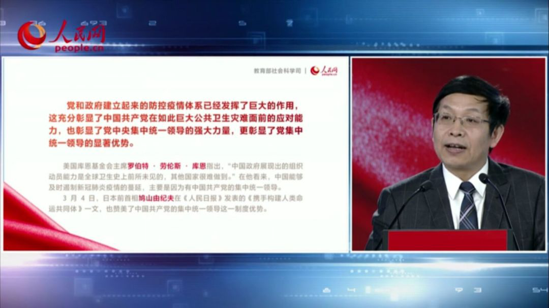 秦宣教授以“疫情大考告诉我们什么”为主题,向我们介绍了中国特色社会主义制度的优越性,在快速、及时、科学、高效的大动员、大集合、大作战中得以充分的展现。他强调面对未来,必须具有风险意识,必须通过改革完善国家体制和治理体系提高风险化解能力。