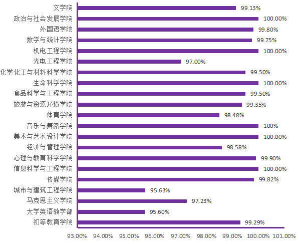 各院(部)的开课数、开课门次、班级数、教师数(人次)、学生数(人次)和学生上课率情况如下图所示: