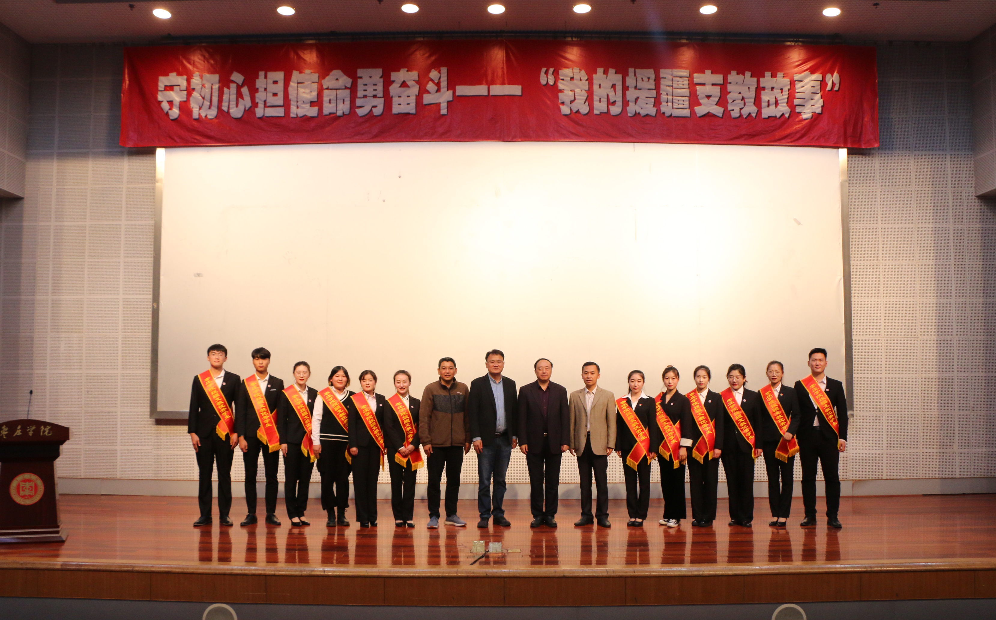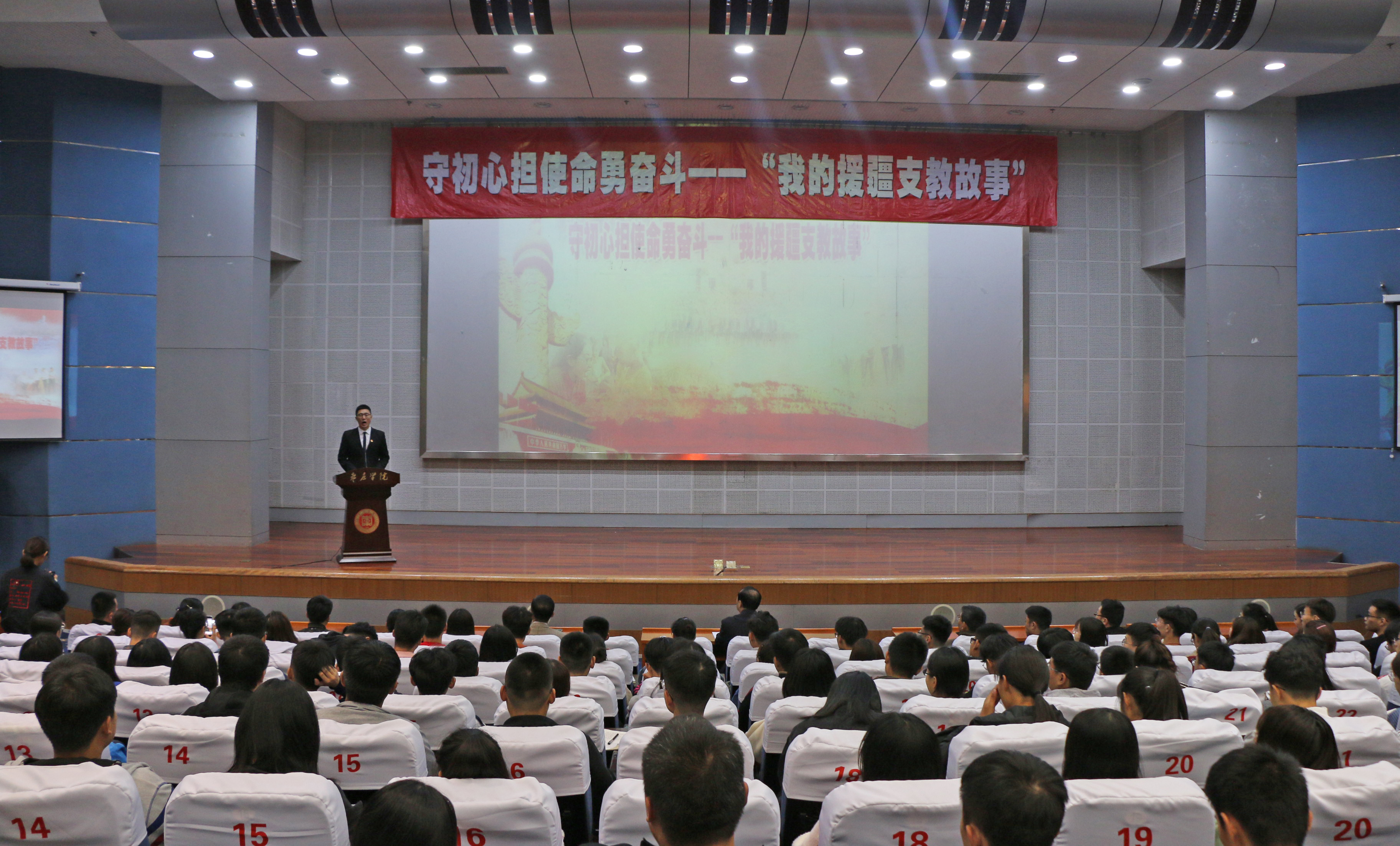 为深入推进“不忘初心、牢记使命”主题教育,强化立德树人使命担当,引导青年学生厚植爱国主义情怀,把爱国情、强国志、报国行融入为实现中华民族伟大复兴中国梦的伟大实践,全面展示援疆支教师生风采,学校分别于10月25日、26日、27日三个下午,在综合楼报告厅举办了“守初心担使命勇奋斗—我的援疆支教故事”分享会。党委书记曹胜强出席分享会并与学生代表合影留念。全校近2000余名同学聆听了分享会。
