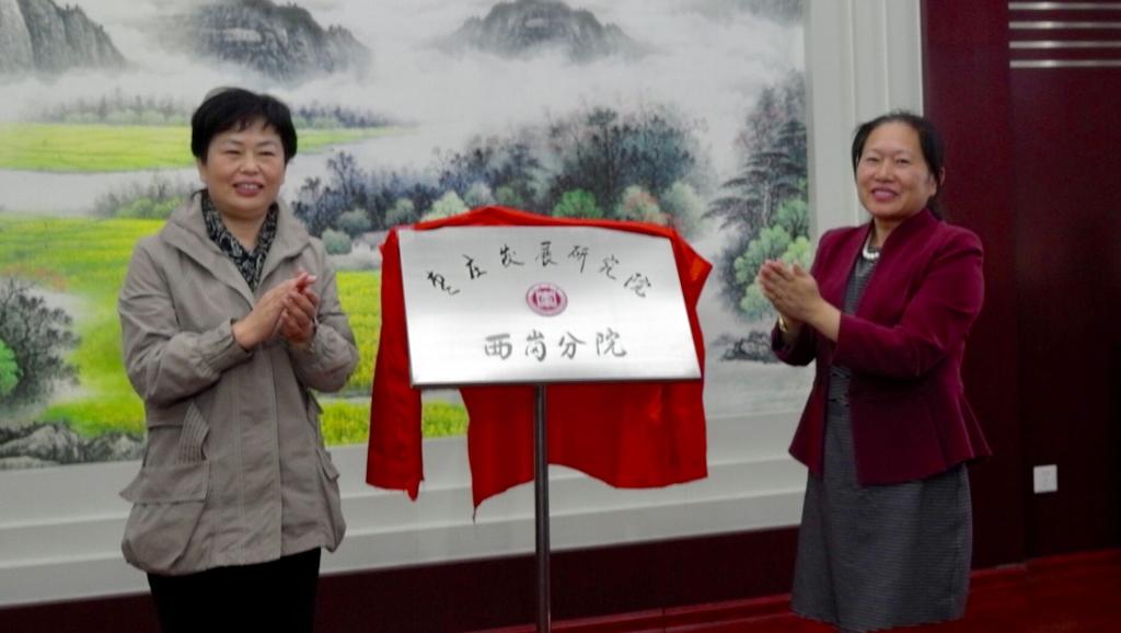 李丽清和刘茜在全体与会人员的见证下共同为枣庄发展研究院西岗分院揭牌。