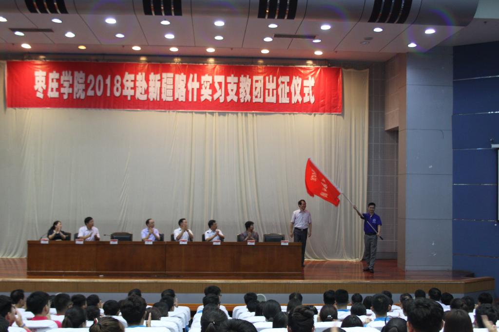 校党委副书记曾宪明给赴疆支教团授旗。查明和师彪分别代表支教教师和学生发言。在刘志国的带领下,赴疆支教团师生进行了宣誓。