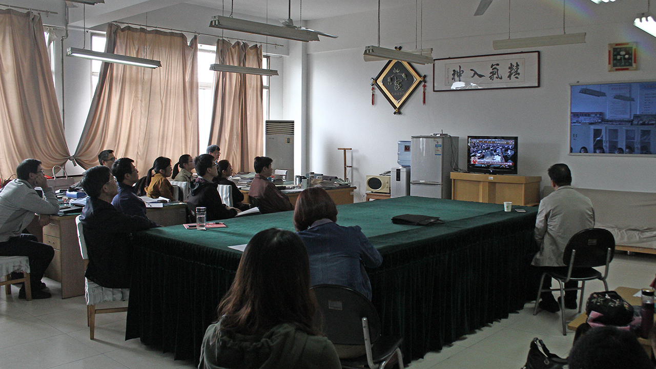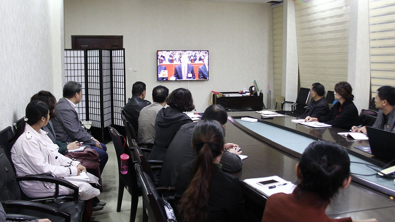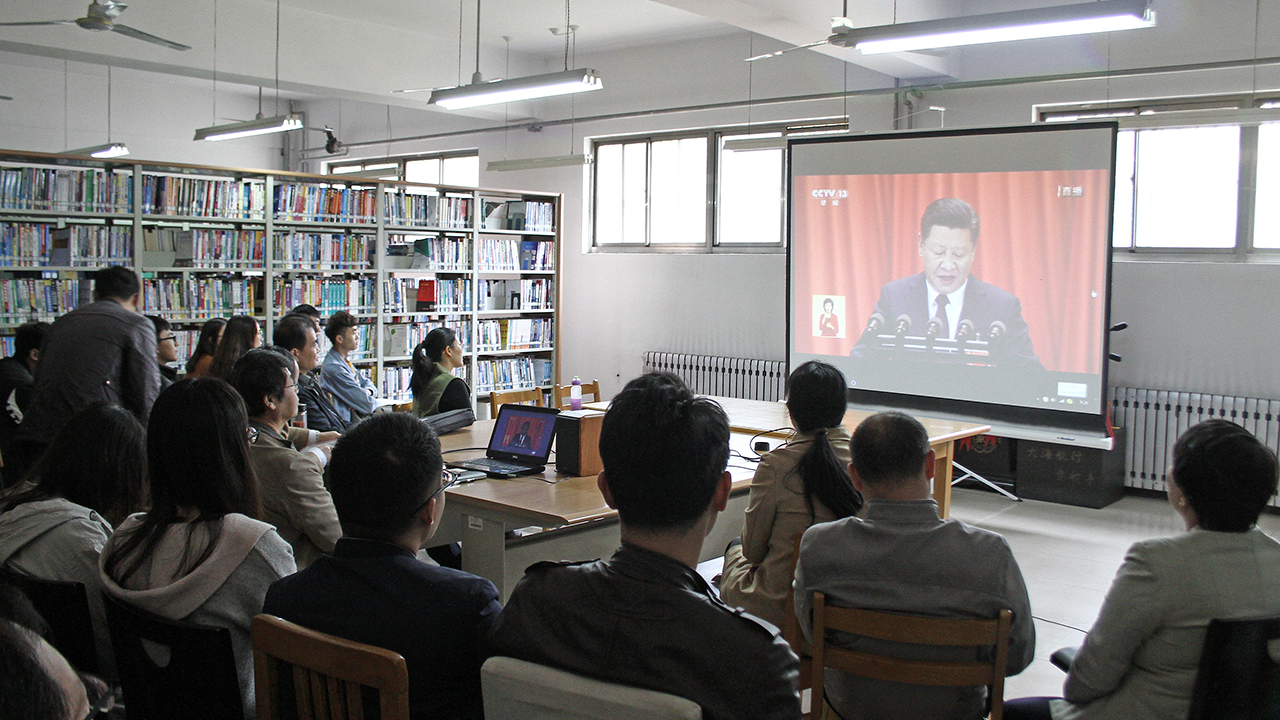 10月18日上午,举世瞩目的中国共产党第十九次代表大会在北京召开。在校校领导李东、李进京、明清河、韩素玲、刘书银与办公室、组织部、宣传部、纪委(监察处)负责人等党委理论学习中心组成员在综合楼八楼会议室观看十九大开幕会实况转播。学生工作处组织学生在学术报告厅观看了十九大直播。各党总支、各单位、各部门组织本单位师生通过各种形式收看了党的十九大开幕会实况。